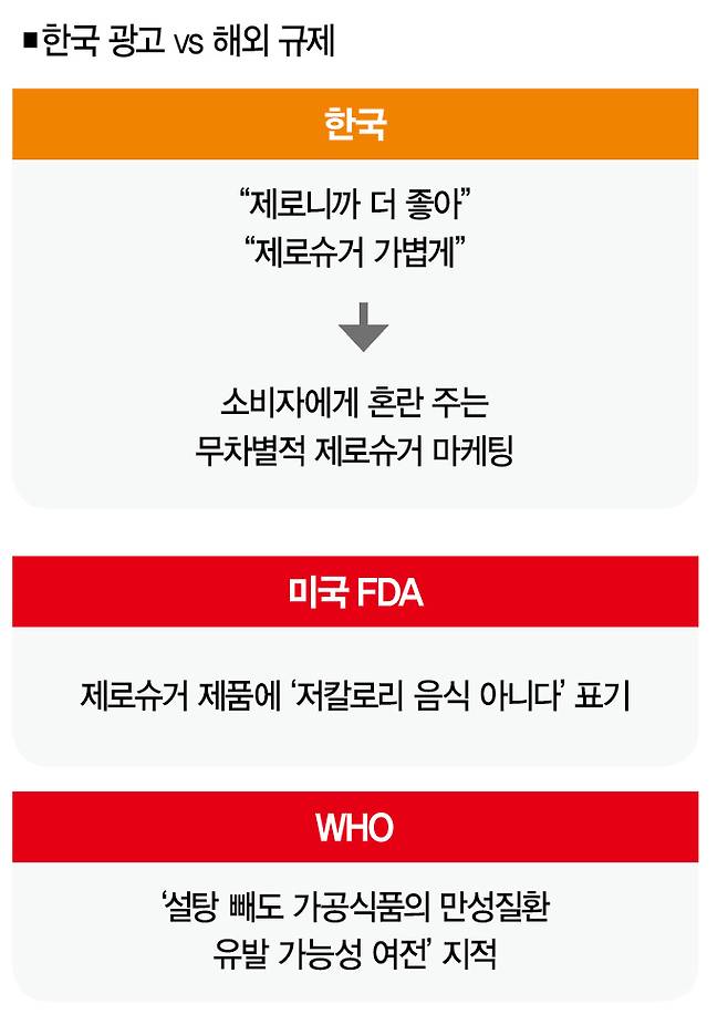 해외는 그렇지 않다. 미국 식품의약국(FDA)은 '영양 및 보충제 성분 표시 규정'을 근거로 제로슈거 제품에 "저칼로리 음식이 아니다(not a low calorie food)" "체중 조절을 위한 것이 아니다(not for weight contr ol)"란 문구를 눈에 띄게 표기하도록 하고 있다.