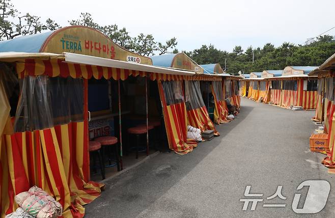 19일 해운대구에 따르면 구와 포장마차촌 상인들은 지속적인 협의 끝에 자진 철거에 합의했다. 오는 24일까지 상인들이 각자 물건을 정리하면 구는 25일부터 60여 명의 인력과 포크레인, 지게차 등을 동원해 잔재물 정리에 나설 예정이다. 해당 포장마차촌이 있던 자리에는 공영주차장이 들어설 예정이다. 사진은 바다마을 포장마차촌 모습. 2024.6.19/뉴스1