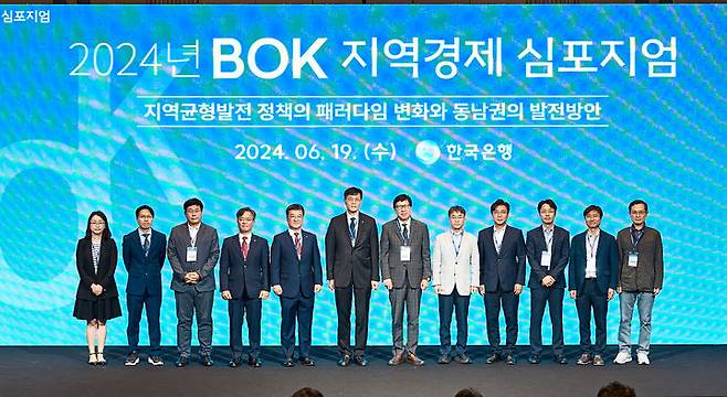 [서울=뉴시스] 이창용 한국은행 총재가 19일 오후 부산 해운대구 시그니엘호텔에서 열린 2024년 BOK 지역경제 심포지엄 오프닝세션에 참석해 참석자들과 기념촬영 하고 있다. 왼쪽부터 이미숙 국립창원대학교 교수, 정민수 한국은행 지역연구지원팀장, 정성문 동아대학교 교수, 김기원 한국은행 부산본부장, 김웅 한국은행 부총재보, 이 총재, 박형준 부산시장, 마강래 중앙대학교 교수, 남기찬 국토연구원 연구위원, 홍지훈 부산대학교 교수, 이근재 부산대학교 교수, 주수현 부산연구원 선임연구위원. (사진=한국은행 제공) 2024.06.19. photo@newsis.com *재판매 및 DB 금지