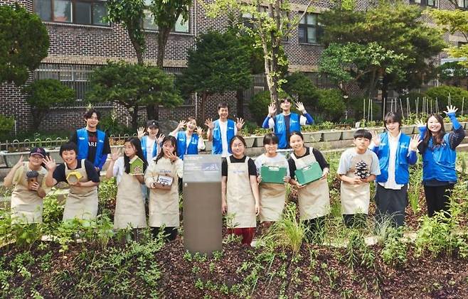 이 학교 학생들이 직접 설계공모전에 참여한 디자인을 바탕으로 아이들과 함께 숲을 가꿨다. 50㎡ 규모 부지에 미선나무, 제주산버들, 부채붓꽃 등 희귀식물을 비롯한 우리나라 자생식물 1225본을 심었다. 올 하반기에는 수도권·지방 사업장 인근에 2호 생태숲을 만들기로 했다.