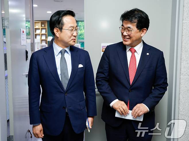 (서울=뉴스1) 안은나 기자 = 박성준 더불어민주당 원내수석부대표(왼쪽)와 배준영 국민의힘 원내수석부대표가 19일 오후 서울 여의도 국회의원회관에서 원구성 관련 회동을 마친 뒤 협상 결렬을 알리고 있다. 2024.6.19/뉴스1