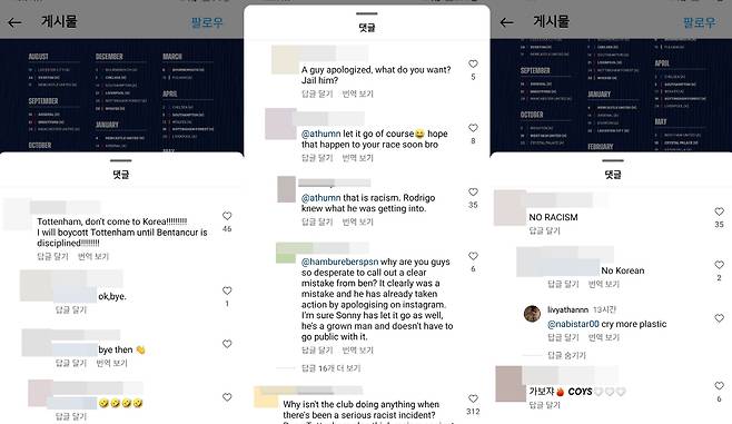 토트넘의 한국 투어를 보이콧하겠다는 댓글에는 '그래 안 간다', '너희는 손흥민의 팬이지 토트넘의 팬이 아니다. 가짜 팬은 필요 없다'며 공격적으로 반응했다. 또 '벤탄쿠르가 사과를 이미 했다. 감옥에라도 가야 하느냐'며 반발했다.