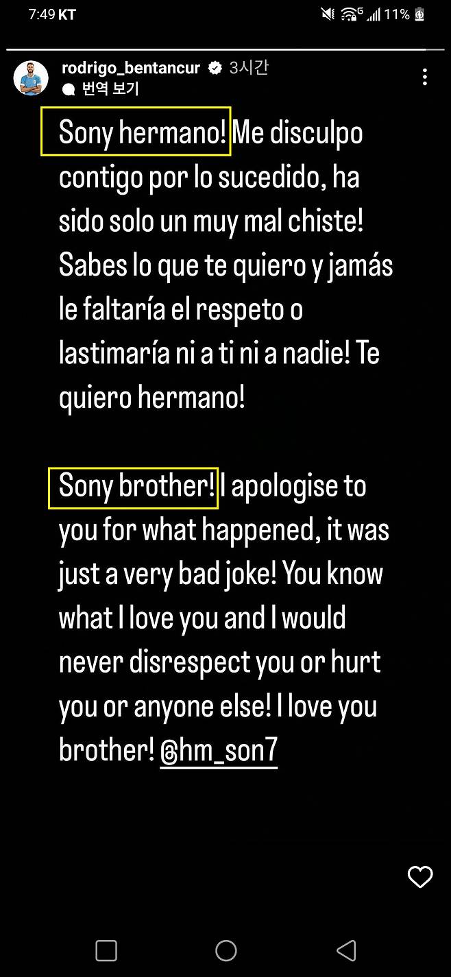 한편 손흥민은 이틀이 지나서 비로소 SNS를 업데이트 했지만 벤탄쿠르 사건과는 무관한 내용이었다.