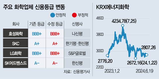 신용등급 전망이 낮아진 것인 비단 효성화학 뿐만이 아니다. 앞서 이달 초 한국신용평가는 국내 2차전지‧반도체용 화학 소재 사업을 영위하는 SKC(011790)의 신용등급 전망을 ‘A+(안정적)’에서 ‘A+(부정적)’로 낮췄다. 한국신용평가는 SK계열의 프로필렌 제조사인 SK어드밴스드의 신용등급도 ‘A-(안정적)’에서 ‘A-(부정적)’로 하향했다. 앞서 글로벌 신용평가사인 S&P글로벌은 LG화학의 신용등급을 ‘BBB+’로 유지하면서도 전망을 ‘부정적’으로 낮추기도 했다.