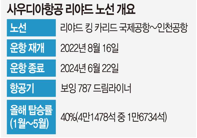 사우디아항공이 운항 중단을 발표한 데에는 저조한 탑승률이 영향을 미쳤을 가능성이 크다는 진단이다. 국토교통부 항공통계를 보면 사우디아항공은 올해 5월까지 138개 운항편을 운영했는데, 공급석 4만1478석 중 여객은 1만6734명에 불과했다. 탑승률 40% 정도에 불과하다. 항공기가 부족할 가능성도 있다. 사우디아항공은 전 세계적으로 노선을 확장 중인데, 비행기 대수는 다소 부족하다는 얘기가 업계에 계속 돌았다.