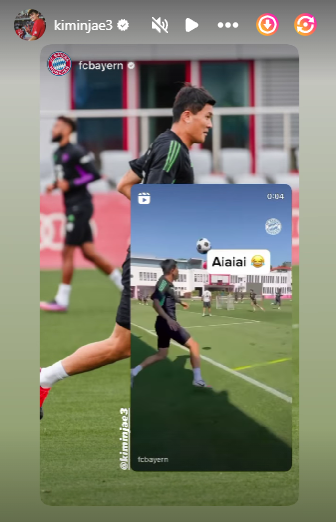김민재는 19일(한국시간) 자신의 소셜네트워크서비스(SNS) 계정에 소속팀 바이에른 뮌헨이 올린 영상을 공유해 게시했다.