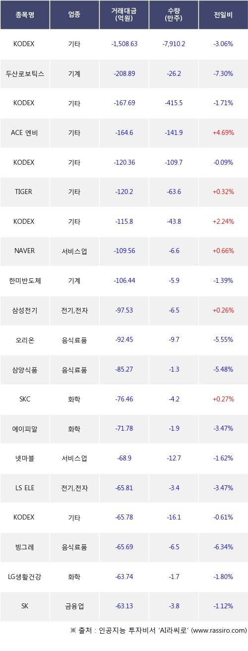19일, 기관 거래소에서 KODEX 200선물인버스2X(-3.06%), 두산로보틱스(-7.3%) 등 순매도