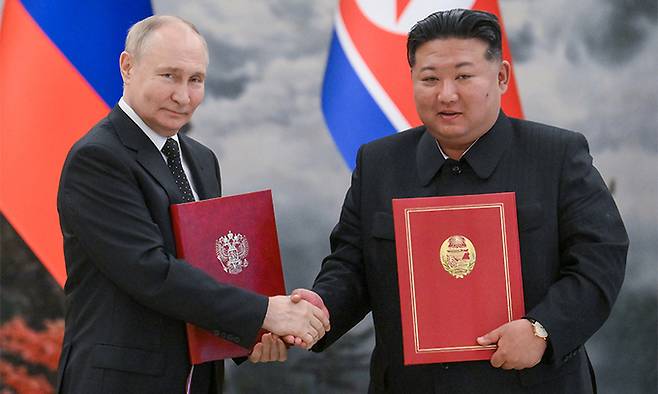 김정은 북한 국무위원장과 블라디미르 푸틴 러시아 대통령이 상대국이 침략을 당할 경우 상호지원하는 내용을 핵심으로 하는 '포괄적 전략 동반자 조약'에 서명했다.