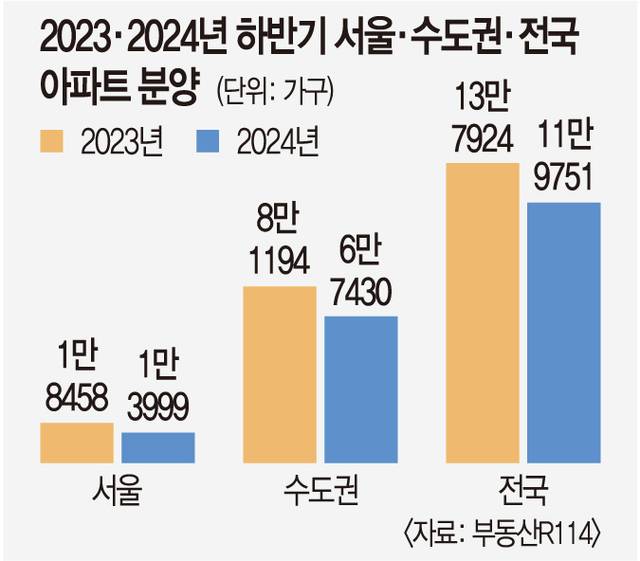 19일 부동산R114의 하반기 분양물량 집계(6월 12일 기준)에 따르면 올해 7~12월 전국의 민영아파트 분양 물량은 총 11만9751가구다. 지난해 하반기(13만7924가구)보다 13% 줄어든 수치다.