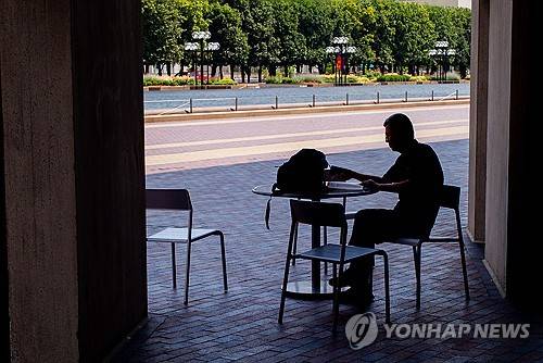 epa11424010 A man escapes the heat while reading a book at a table in the shade along side the reflecting pool on the Christian Science Plaza in Boston, Massachusetts, USA, 19 June 2024. Temperatures reached 95F (35C) in the downtown Boston area with a real feel of 100F (38C) on the second day of a heat wave. EPA/CJ GUNTHER