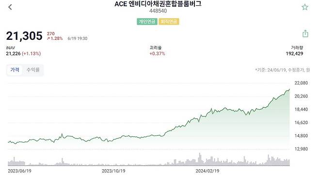 엔비디아를 담고 있으면서도 채권형으로 분류돼 퇴직연금 계좌에서 비중 100%까지 투자할 수 있는 상품도 있습니다. ‘ACE 엔비디아채권혼합블룸버그’는 엔비디아를 31.32%까지 편입하고 나머지 자산은 국고채에 투자합니다. 1년 수익률은 52.83%로 채권형 ETF 중 압도적인 성적을 내고 있습니다.