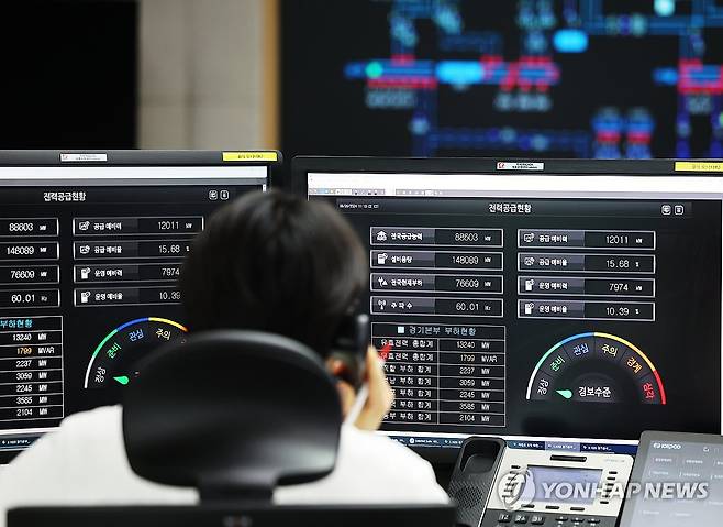 (수원=연합뉴스) 홍기원 기자 = 폭염이 이어지며 전력 수요가 증가하고 있는 20일 오전 경기도 수원시 영통구 한국전력공사 경기본부 전력관리처 계통운영센터에서 관계자들이 전력수급상황을 주시하고 있다.