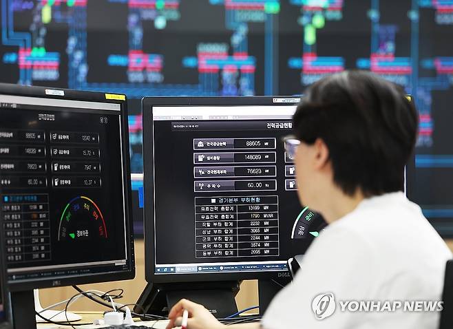 (수원=연합뉴스) 홍기원 기자 = 폭염이 이어지며 전력 수요가 증가하고 있는 20일 오전 경기도 수원시 영통구 한국전력공사 경기본부 전력관리처 계통운영센터에서 관계자들이 전력수급상황을 주시하고 있다.