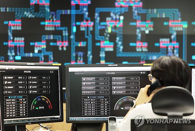 (수원=연합뉴스) 홍기원 기자 = 폭염이 이어지며 전력 수요가 증가하고 있는 20일 오전 경기도 수원시 영통구 한국전력공사 경기본부 전력관리처 계통운영센터에서 관계자들이 전력수급상황을 주시하고 있다.