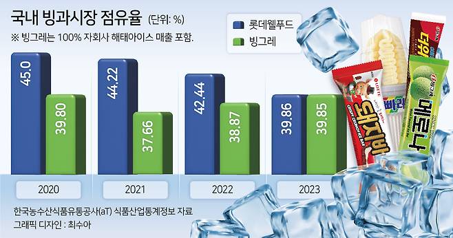빙과 업계에서는 롯데웰푸드와 빙그레가 1위 자리를 놓고 초박빙 경쟁을 벌이고 있다. 지난해 기준 점유율 1위는 롯데웰푸드다. 빙그레는 2020년 해태아이스크림을 인수한 후 점유율 격차를 꾸준히 좁혀왔다. 한국농수산식품유통공사(aT) 식품산업통계정보에 따르면 소매점 기준 지난해 국내 빙과 시장 점유율은 롯데웰푸드가 39.86%, 빙그레(해태 포함)가 39.85%다. 불과 0.01%p(포인트) 차이다.
