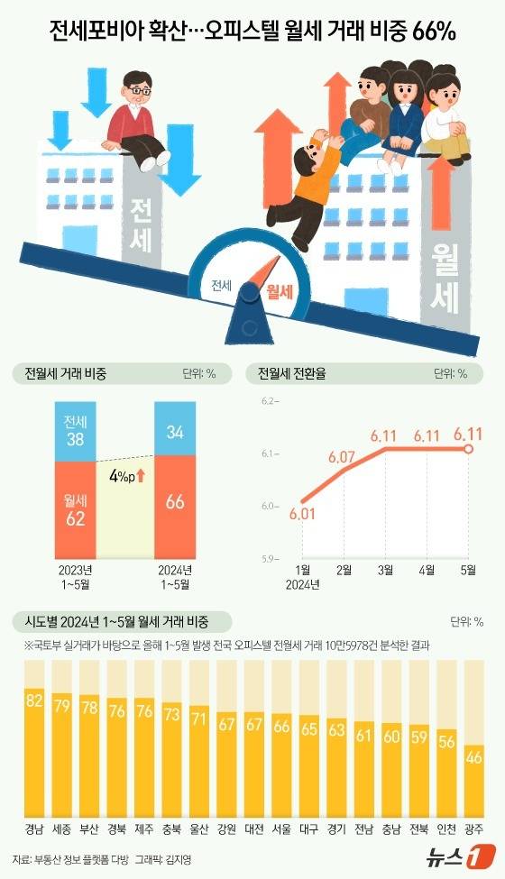 (서울=뉴스1) 김지영 디자이너 = 최근 비아파트 전세 시장 부진이 지속하며, 오피스텔 임대차 거래에서도 월세 강세가 심화하는 모양새다.