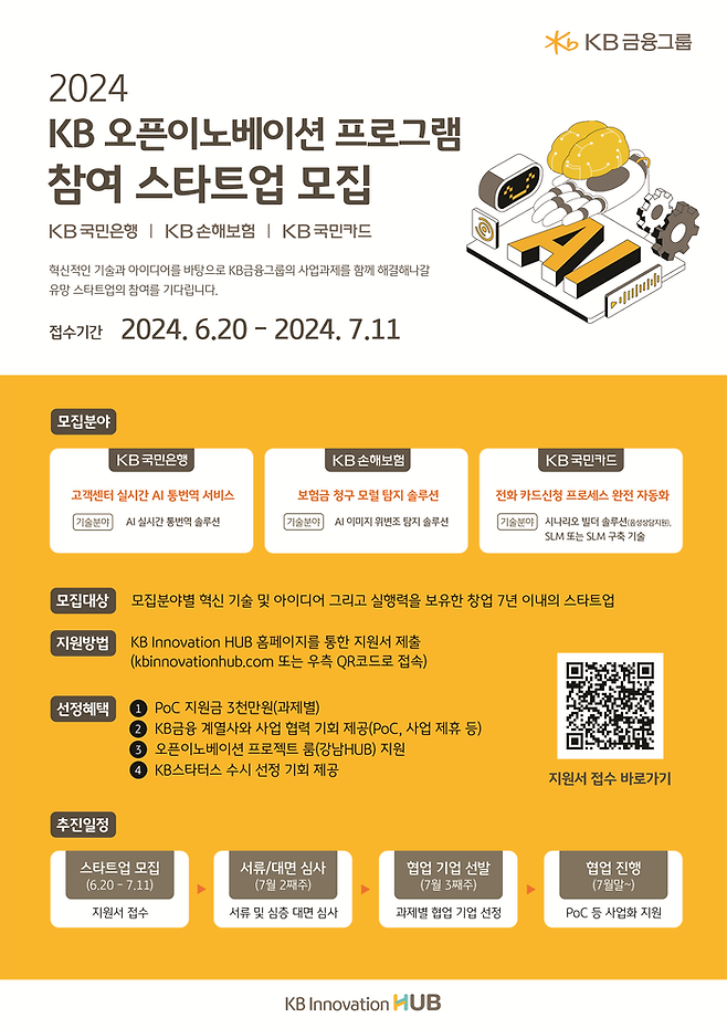 선정된 스타트업에는 사업화 검증에 필요한 지원금(과제별 3000만원)과 KB금융 이노베이션 허브가 운영하는 ‘강남 허브(HUB)’ 내 프로젝트 룸 등이 지원된다.