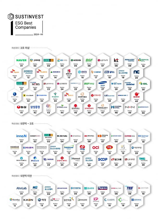 네이버, 고려아연, 현대홈쇼핑이 서스틴베스트가 선정한 2조원 이상 그룹 중 ESG 베스트 컴퍼니로 꼽혔다. 5000억 이상 2조원 미만 그룹에서는 HK이노엔, 한샘, 현대그린푸드가 선정됐다. 5000억 미만 그룹에서는 안랩, 한미글로벌, 포스코엠텍이 각각 1,2,3위에 올랐다.