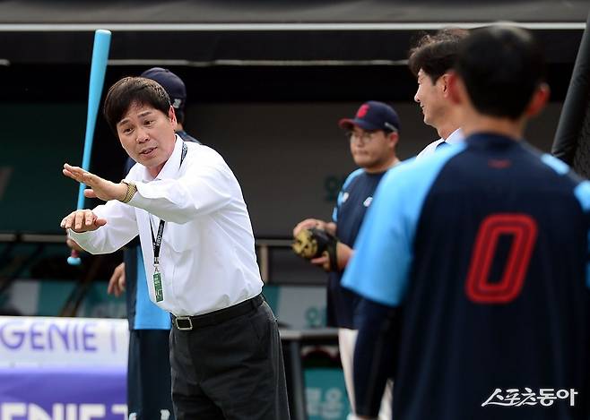 20일 경기도 수원 KT위즈파크에서 ‘2024 신한 SOL 뱅크 KBO리그’ KT 위즈와 롯데 자이언츠의 경기가 열린다. 경기 전 전준호 해설위원이 롯데 황성빈에게 이야기하고 있다. 수원 | 김민성 기자 marineboy@donga.com
