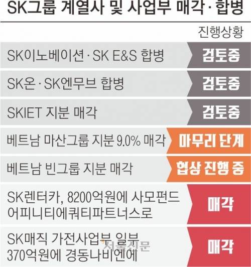 SK이노베이션과 SK E&S뿐 아니라 다른 계열사들의 합병설과 매각설도 이어지고 있다. 앞서 전기차 배터리 계열사 SK온을 윤활유 제조 기업 SK엔무브와 합병해 상장하는 방안, 배터리 분리막 제조 기업 SK아이이테크놀로지(SKIET) 지분을 매각해 투자 자금을 확보하는 방안, SK E&S와 SK온을 합병하는 방안 등이 거론돼 왔다.
