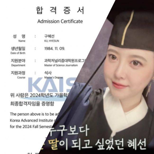 20일 구혜선은 자신의 SNS를 통해 "일어나자마자..멍......카이스트 과학저널리즘 대학원 공학석사 과정에 합격했어요"라는 글과 함께 사진을 게재했다. 공개된 사진은 구혜선이 2024학년도 가을학기 카이스트 과학저널리즘 대학원 프로그램 석사 분야에 합격했다는 내용. 합격증서였다.