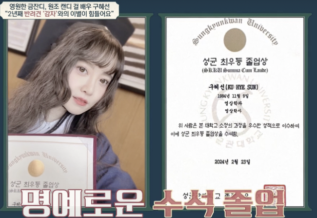 과거 결혼 4년만에 이혼을 발표, 구혜선은 그 동안 학업에 매진했다고 했다. 무려 수석으로 졸업한 학점이 4.5중 평균 4.27, 백분율이 97.7% 달성했을 정도. 이 외에도 그렇게 자신의 존재와 능력을 끊임없이 증명해온 구혜선. 가수, 작가, 영화감독까지 N잡러로 활약 중이다.