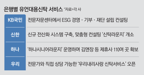 고령화가 심화되면서 노후를 준비하기 위해 금융사의 자산 신탁을 찾는 사람들이 늘고 있다. 상속 배분 등을 맡기는 유언대용신탁뿐 아니라 자산가들의 전유물로 여겨지던 기부 신탁에 대한 관심도 커져 시중은행들이 관련 서비스를 강화하고 있다.