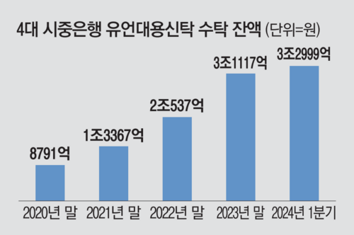 20일 금융권에 따르면 KB국민·신한·하나·우리은행 등 4대 은행의 유언대용신탁 잔액은 지난 1분기 3조2999억원을 기록했다. 지난 2021년 말(1조3367억원)의 2.5배로 늘었다.