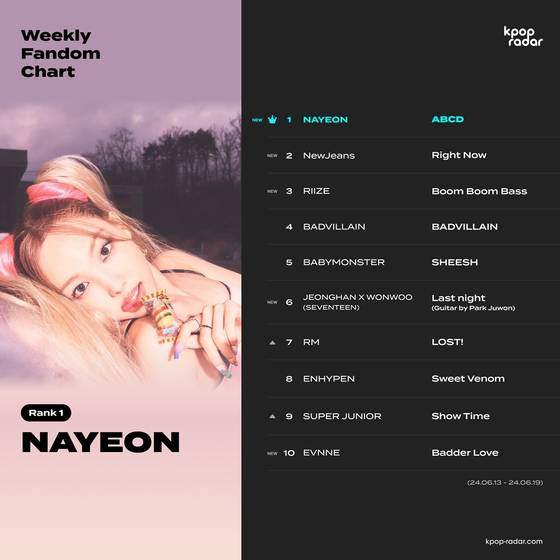 이번 주 케이팝레이더에서 발표된 위클리 팬덤 차트의 TOP 10에는 걸그룹 뉴진스(NewJeans)의 '라잇 나우(Right Now)'가 2위로 그룹 라이즈(RIIZE)의 '붐붐베이스(Boom Boom Bass)'가 3위로 진입했다. 이어 그룹 세븐틴의 유닛 정한·원우의 '어젯밤'이 6위로 그룹 이븐(EVNNE)의 '배더 러브(Badder Love)'가 10위로 진입했다.