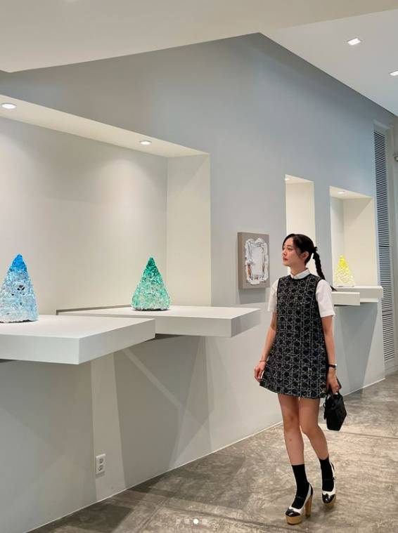 양갈래로 땋은 머리로 전시장을 찾은 여전히 청순한 비주얼로 작품을 감상하는 모습이다.