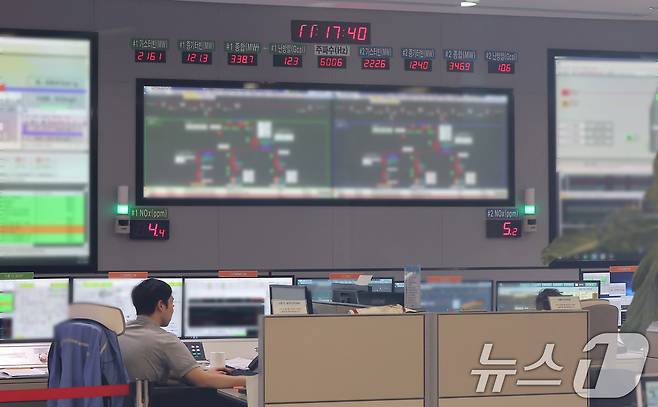 (서울=뉴스1) 김진환 기자 = 때 이른 무더위로 냉방 전력 수요가 급증하고 있는 21일 서울 마포구 한국중부발전 서울발전본부 중앙제어실에서 직원들이 발전 출력 현황을 점검하고 있다. 2024.6.21/뉴스1