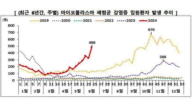 한편 마이코플라스마 폐렴균 감염증도 최근 4주 동안 1.7배 증가하면서 유행하고 있는데 코로나19 유행 이전 국내에서는 3~4년 주기로 유행(최근 2019년)했지만, '23년 동절기 유행에 이어 올해 다시 유행 중입니다.전국 200병상 이상 병원급 표본감시 참여 의료기관(220개소) 대상 최근 4주간(5.4주~6.3주) 입원환자 수(1,451명)가 코로나19 유행 이전 '19년(521명) 동기간 대비 약 3배, 지난해 동기간 대비(185명) 약 8배 많은 상황입니다.