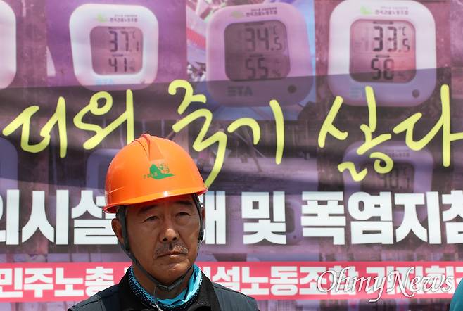 | ▲ 민주노총 전국건설노동조합이 19일 오전 서울 영등포구 국회 앞에서 건설현장 편의시설 실태 및 폭염지침 법제화 촉구 기자회견을 열고 있다. |