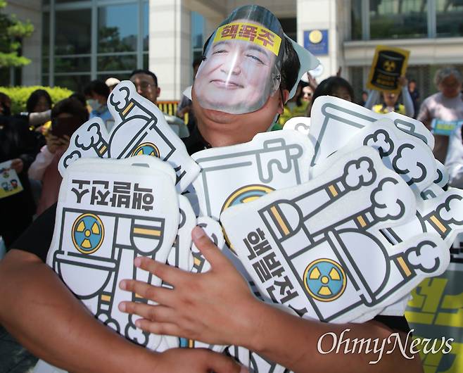 | ▲ [18일 화] 고리원자력발전소 1호기 영구 정지 8년을 맞아 160여 개 단체가 결집해 있는 부산고리2호기수명연장·핵폐기장 반대 범시민운동본부와 70여 개 단체가 뭉친 탈핵부산시민연대가 합동으로 부산시청 광장에서 기자회견을 열고 윤석열 대통령에게 26기의 핵발전소를 전달하는 퍼포먼스를 하고 있다. |