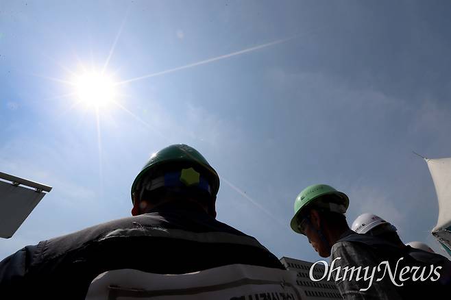 | ▲ [19일 수] 민주노총 전국건설노동조합이 서울 영등포구 국회 앞에서 건설현장 편의시설 실태 및 폭염지침 법제화 촉구 기자회견을 열고 있다. 이들은 서울지역에 올여름 첫 발효된 폭염주의보 속에서 폭염기 건설현장 실태 등을 고발하며 '폭염기 건설현장 휴게실과 그늘막 설치 확대 강화' 등의 법제화를 촉구했다. |