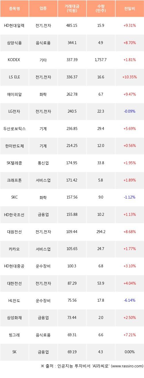 HD현대일렉트릭, 삼양식품, KODEX 200선물인버스2X 등은 전일 대비 주가가 상승했고, LG전자, SKC, HL만도 등은 주가가 하락했다.