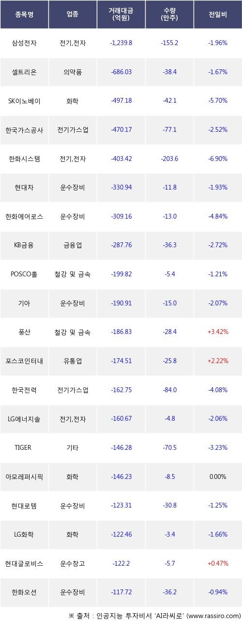 외국인 투자자의 순매도 상위 20개 종목은 삼성전자, 셀트리온, SK이노베이션, 한국가스공사, 한화시스템, 현대차, 한화에어로스페이스, KB금융, POSCO홀딩스, 기아등이다.