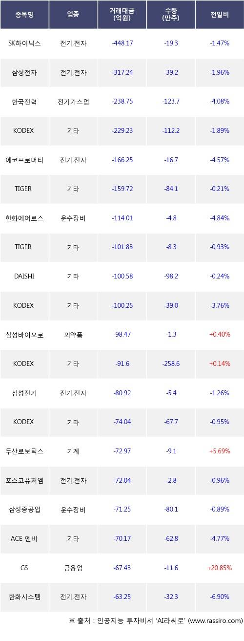 기관 투자자의 순매도 상위 20개 종목은 SK하이닉스, 삼성전자, 한국전력, KODEX 레버리지, 에코프로머티, TIGER 미국S&P500, 한화에어로스페이스, TIGER 미국나스닥100, DAISHIN343 AI반도체&인프라액티브, KODEX 미국반도체MV등이다.