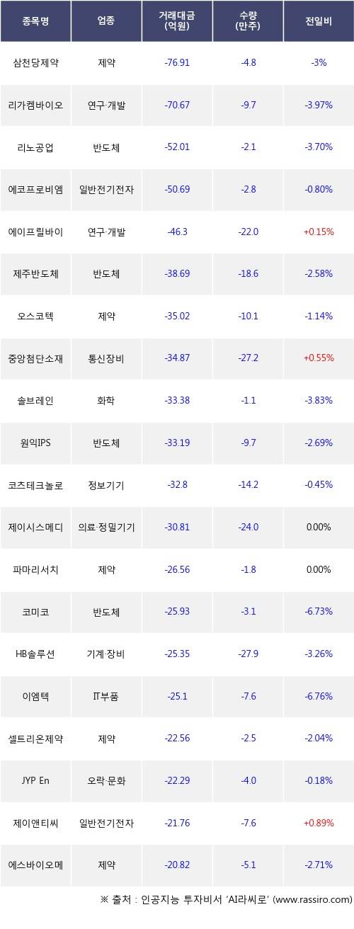 외국인 투자자의 순매도 상위 20개 종목은 삼천당제약, 리가켐바이오, 리노공업, 에코프로비엠, 에이프릴바이오, 제주반도체, 오스코텍, 중앙첨단소재, 솔브레인, 원익IPS등이다.