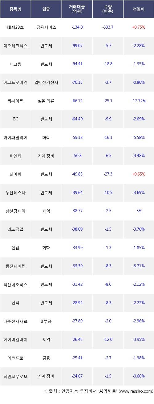 기관 투자자의 순매도 상위 20개 종목은 KB제29호스팩, 이오테크닉스, 테크윙, 에코프로비엠, 씨싸이트, ISC, 아이패밀리에스씨, 피엔티, 와이씨, 두산테스나등이다.
