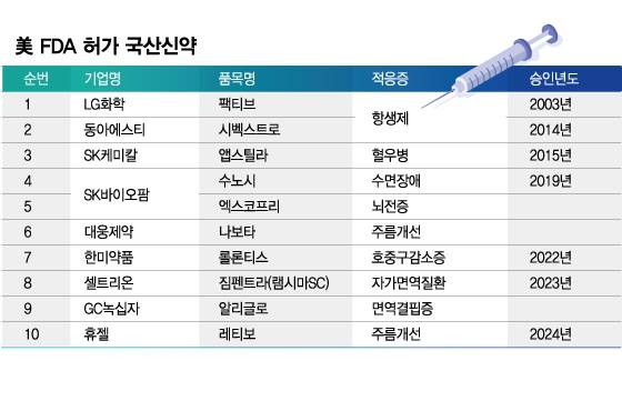 특히 미국은 세계 최대 시장답게 가장 엄격한 의약품 허가 기준을 보유한 국가다. 미국 허가는 곧 글로벌 시장에서 통용될 수 있는 기술력을 입증했다는 의미다. 현재까지 미국 식품의약국(FDA) 허가를 획득한 국산신약은 총 10개 품목이다. 2003년 LG화학 항생제 '팩티브'를 시작으로 연초 휴젤의 주름개선용 보툴리눔 톡신 '레티보'까지 허가 품목을 늘려왔다.