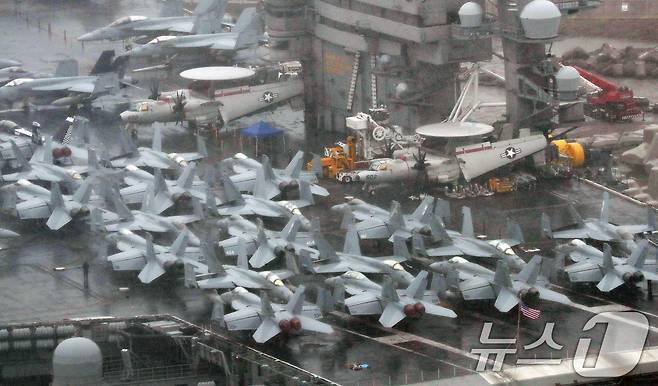부산 입항한 美항모 '루스벨트' 갑판 위 빼곡한 전투기