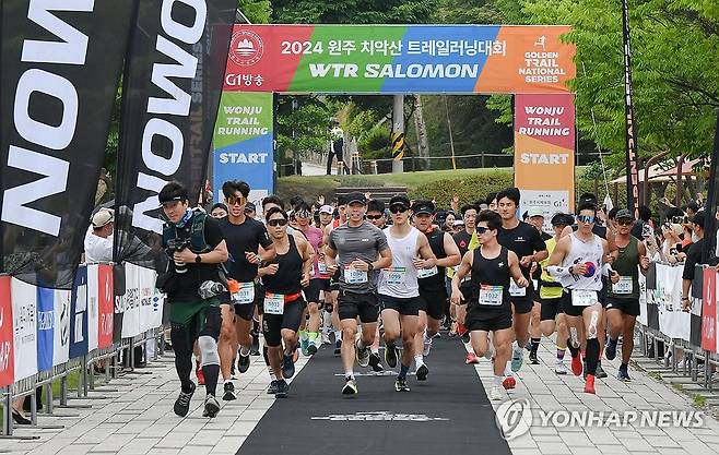 (원주=연합뉴스) 도심을 벗어나 숲길을 달리는 힐링 스포츠로 주목받는 2024 치악산 트레일러닝 대회가 22일 원주 치악산 일원에서 개막한 가운데 참가자들이 출발 신호에 맞춰 레이스를 펼치고 있다. 2024.6.22 [원주시 제공.재판매 및 DB 금지]