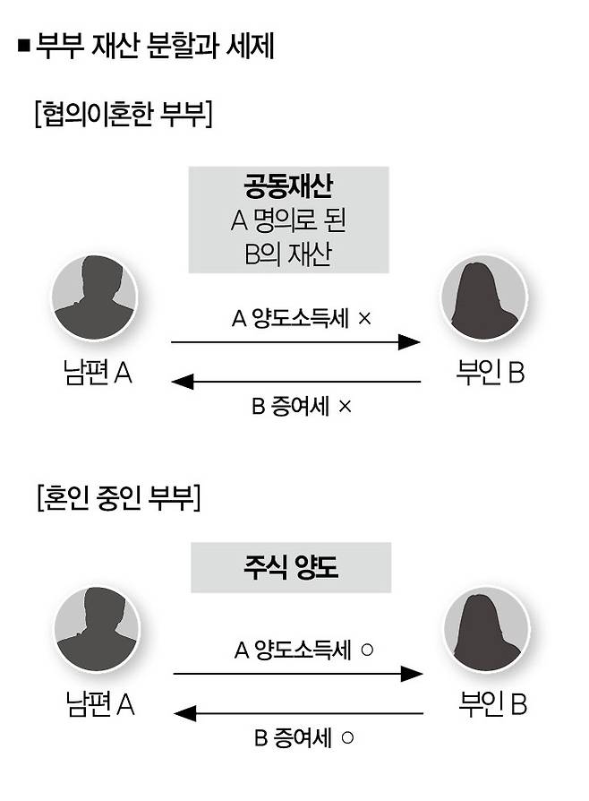 그럼 대법원에서 원심을 유지하는 판결을 하면 세금은 어떻게 될까. 재산분할 청구 확정에 따라 A가 B에게 주식을 넘겨주는 경우, B가 자기 것을 되찾아오는 거래(공유분할의 법칙)에 불과하기 때문에 양도소득세 과세 대상이 아니라는 게 대법원의 입장이다(96누14401 판결). 그래서 A는 1조4000억원의 주식을 넘길지라도 양도소득세 부담은 없다.