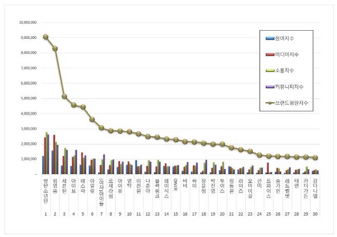 6월 가수 브랜드평판 30위 순위는 방탄소년단, 임영웅, 세븐틴, 아이브, 에스파, 아일릿, (여자)아이들, 르세라핌, 아이유, 영탁, 이찬원, 나훈아, 블랙핑크, 데이식스, QWER, 비비, 싸이, 장윤정, 박진영, 투어스, 정동원, 라이즈, 오마이걸, 선미, 트와이스, 송가인, 레드벨벳, 태연, 카더가든, 강다니엘 순으로 분석됐다.