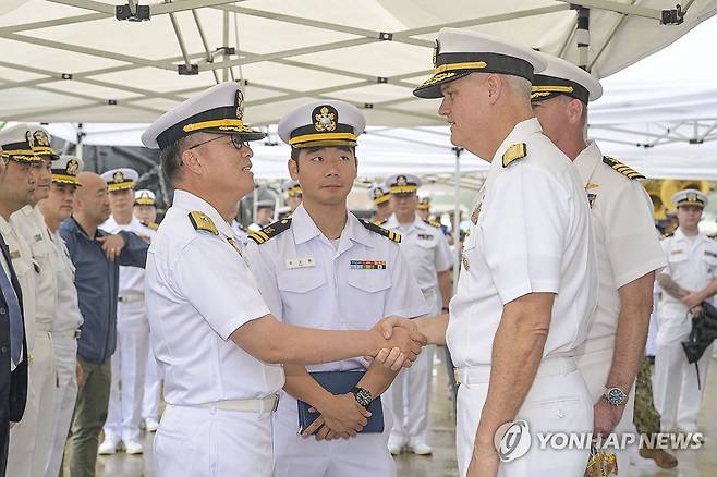 (서울=연합뉴스) 한국·미국·일본의 첫 다영역 군사훈련 '프리덤 에지'에 참여하기 위해 22일 부산 해군작전기지에 입항한 미 해군 항공모함 시어도어 루즈벨트함 입항 환영식에서 해군작전사령부 해양작전본부장인 이재섭 준장(왼쪽)과 미 해군 제9항모강습단장인 크리스토퍼 알렉산더 준장이 악수하고 있다. 2024.6.22