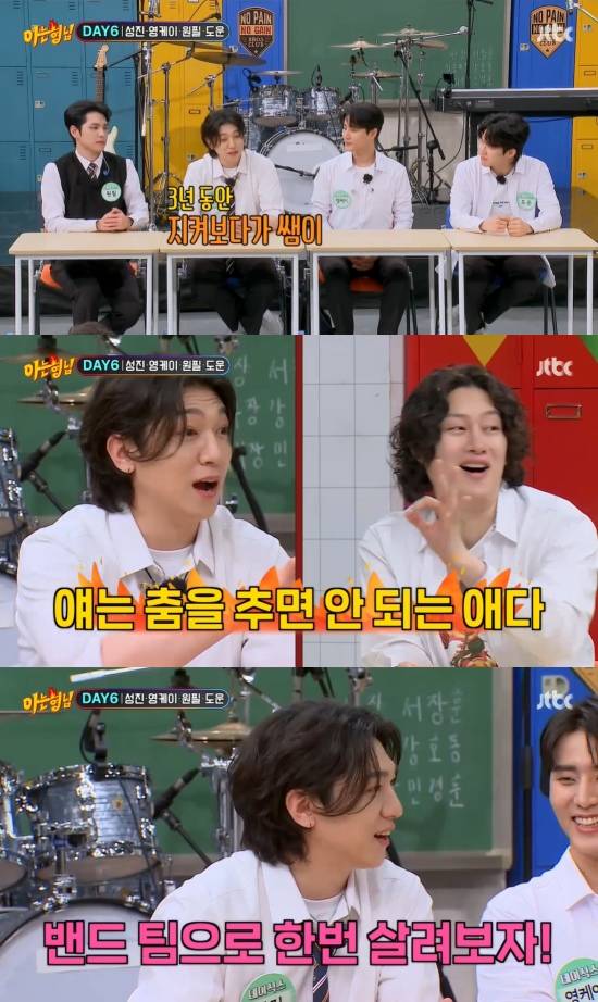 'JYP 1호 밴드'라는 수식어를 가진 데이식스. 아이돌 명가 JYP에서 어떻게 밴드로 데뷔하게 됐냐는 강호동의 질문에 성진은 "사실 처음 밴드를 구성할 때는, 사실 JYP에 들어왔으면 춤도 추고 그래야하는데, 내가 춤을 진짜 못 춘다"고 고백했다. 이에 김희철은 "얼굴에 춤이 없어"라고 반응했다.