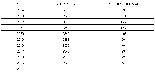 5월 기준 2020년 224만9천명이던 청년층 상용직은 2년 연속 증가해 2022년 255만8천명까지 늘었지만, 작년 254만8천명으로 감소한 이후 올해까지 2년째 줄었다.