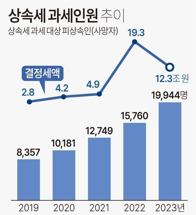 최근 몇몇 언론에서 상속세가 '중산층 세금'이 됐다는 다소 자극적인 제목의 기사들을 썼습니다. 근거는 이렇습니다. 상속세가 부과된 피상속인(사망자) 수가 2017년 6천986명에서 지난해 1만 9천944명으로, 6년 새 무려 3배가 됐다는 겁니다. 과거 ‘1% 부자들’만 내는 세금으로만 여겨졌던 상속세의 저변이 크게 확대되고 있음을 강조한 의도로 풀이되는데, 어쨌거나 상속세 과세 대상이 해마다 급증하고 있는 건 맞습니다.