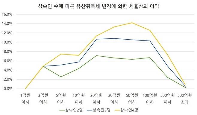 유산취득세 자체로 감세 효과도 있습니다. 유산취득세를 적용하면 세율을 적용하는 대상인 과세표준이 낮아지기 때문에 상속인들이 내야 하는 세 부담이 일반적으로 줄어듭니다. 지난해 정의당 장혜영 의원이 국회예산정책처에 시뮬레이션을 의뢰한 결과를 보면, 유산세에서 유산취득세로 전환 시 상속인이 많을수록 세율 이익이 커지며 상속인이 4명일 경우 세율이 최대 14.2%p 하락하는 걸로 나타났습니다.